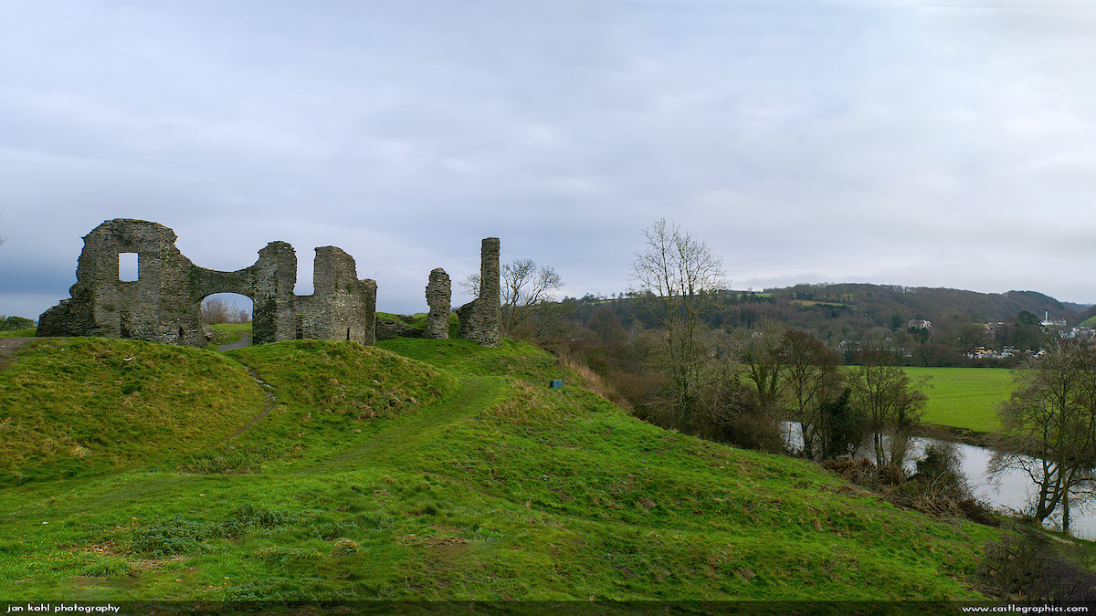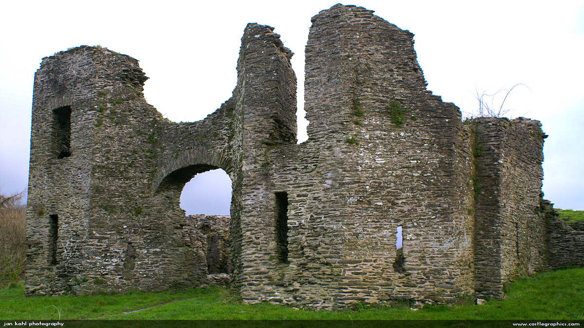 he time-worn remains of this castle, on a picturesque, grassy site overlooking a loop on the River Teifi, were once inhabited by, amongst others, Sir Rhys ap Thomas, friend of Henry VII. It would be hard to imagine a more serene setting than this, and one is not surprised to find that it was once intended as a county seat rather than a military post. Yet it had its share of excitement in the Civil War, when held for the king and blown up with gunpowder at the close of the struggle. There are remnants of some of the walls and the ruins of the gate. It is significant as the only native Welsh castle to be built in stone in this part of Wales.