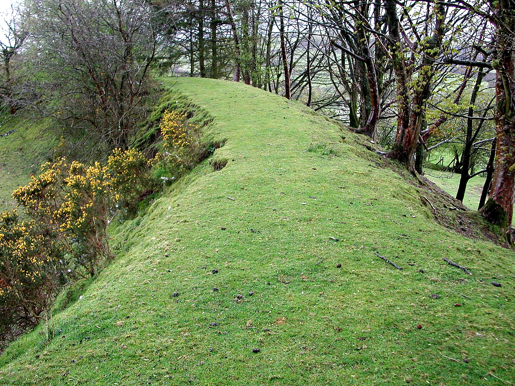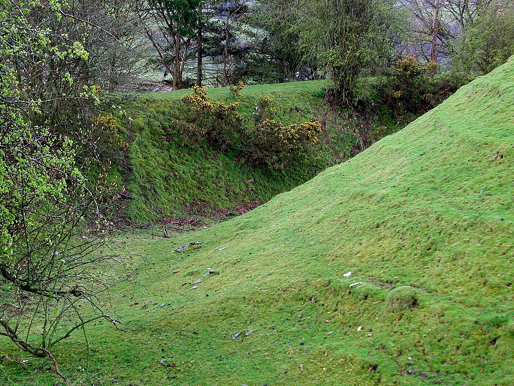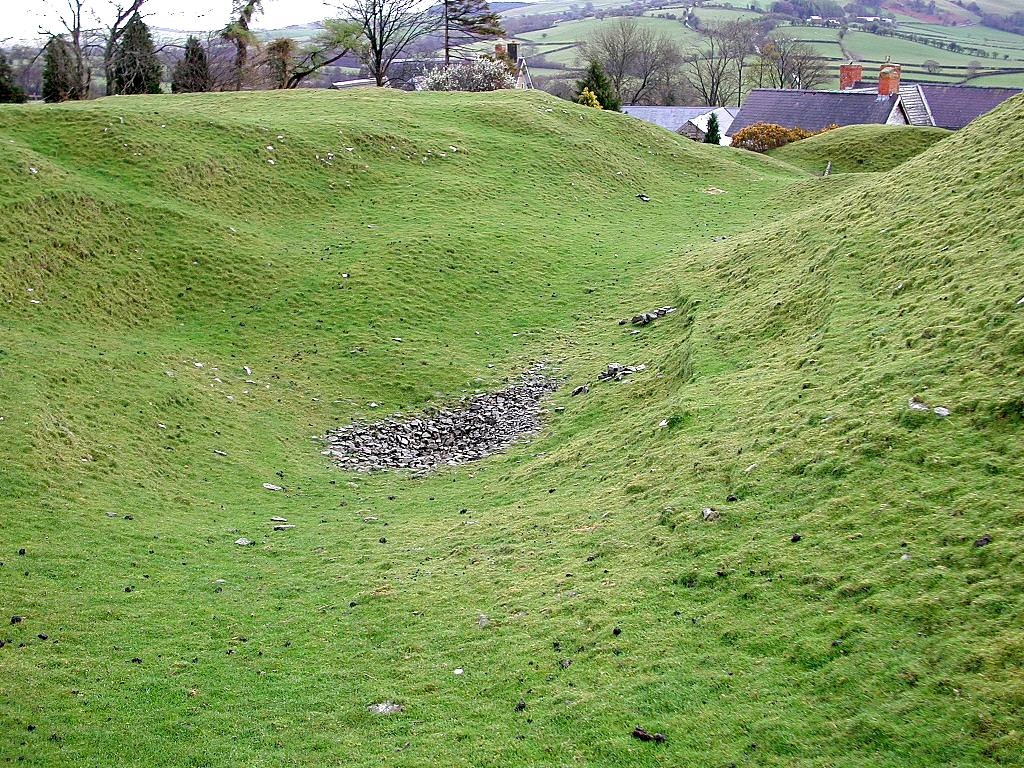 Below: view of the top of the main ditch surrounding the motte at Painscastle.