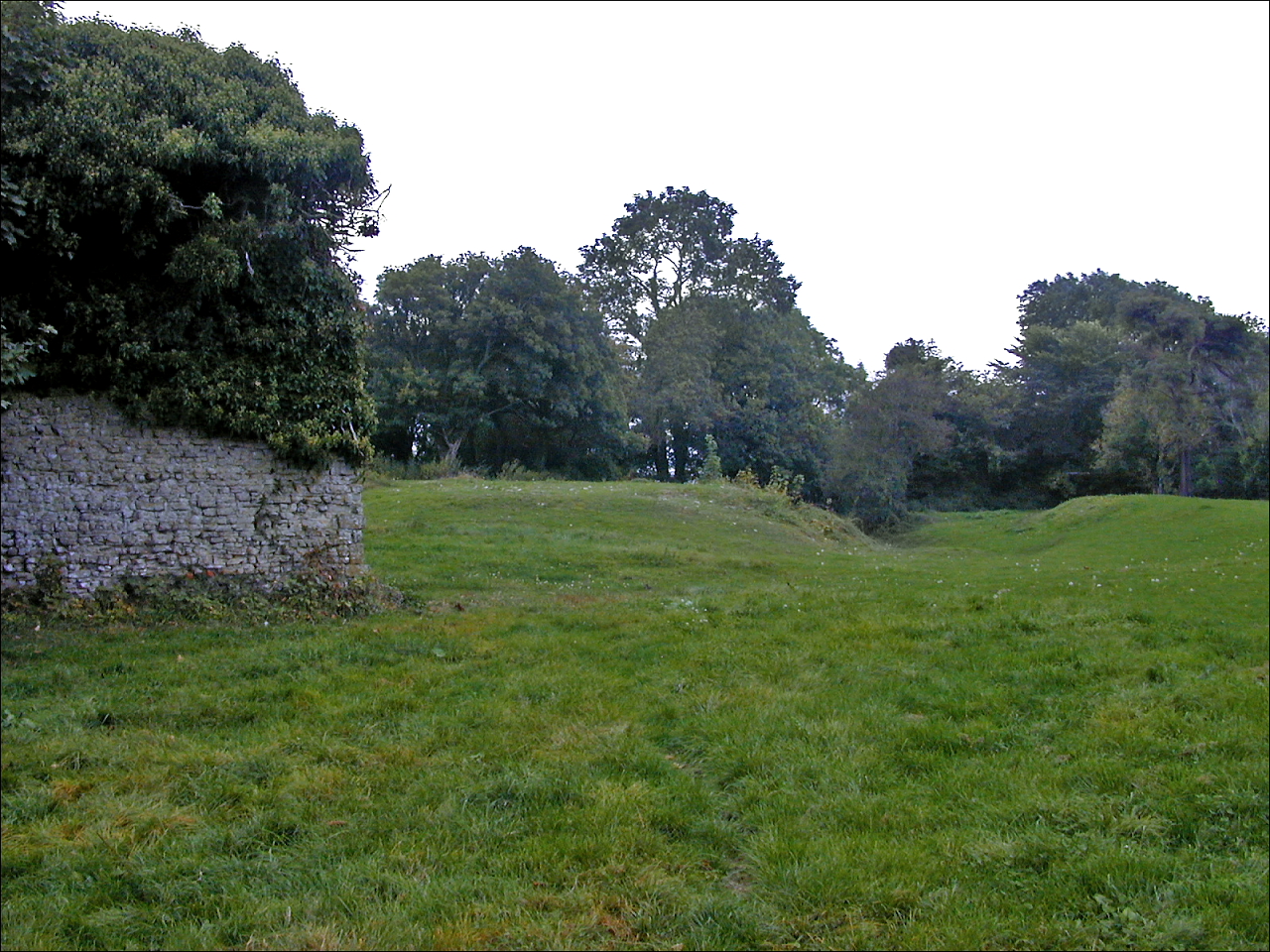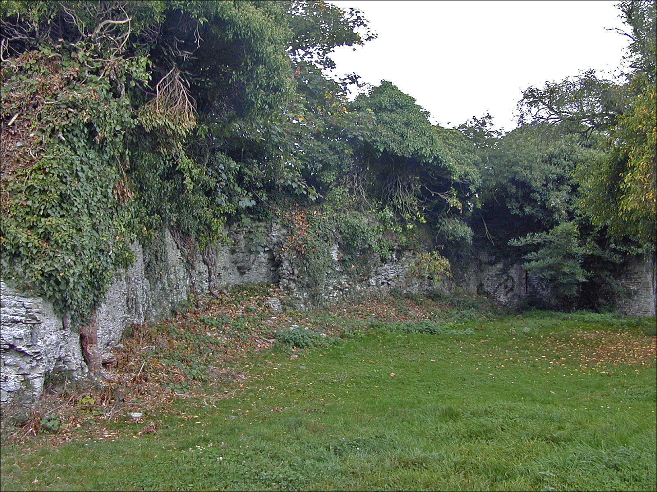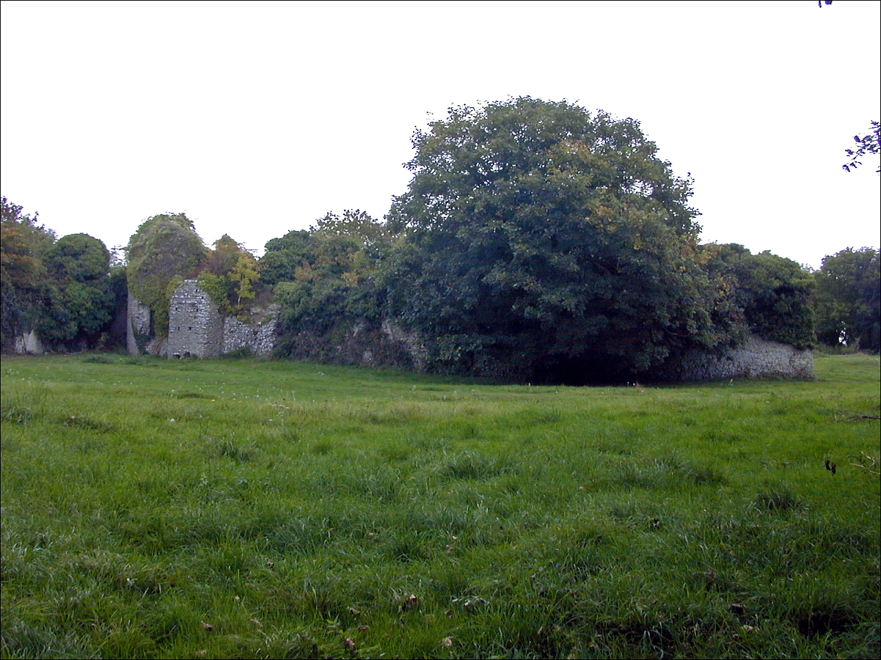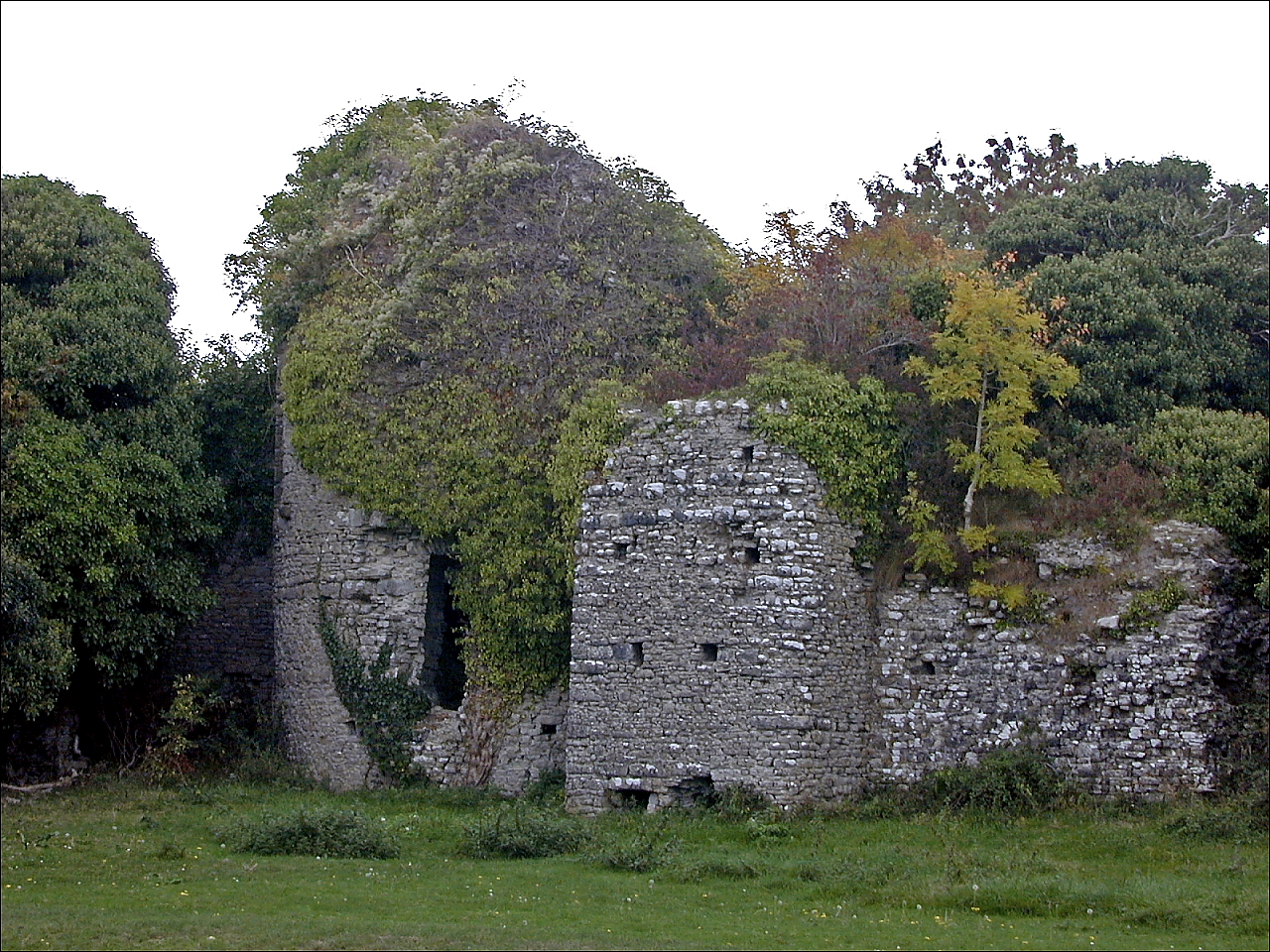 Overlooking the 30m deep ravine of the River Waycock north of the church are the remains of a 13th century wall 1m thick around a court 65m long by 47m wide with a more thinly walled 16th century outer court to the west. The moat has been filled in but there are extensive footings on the east side of the court and on the west side are overgrown ruins of a tower 7m in diameter with a rectangular latrine turret to the south and various other structures. Gilbert de Umfraville had a timber castle on this site in the 12th century. In the time of Edward II Oliver de St John obtained the castle when he married Elizabeth Umfraville, the young heiress. Mike Salter, The Castles of Gwent, Glamorgan & Gower, Folly Publications, 1991.