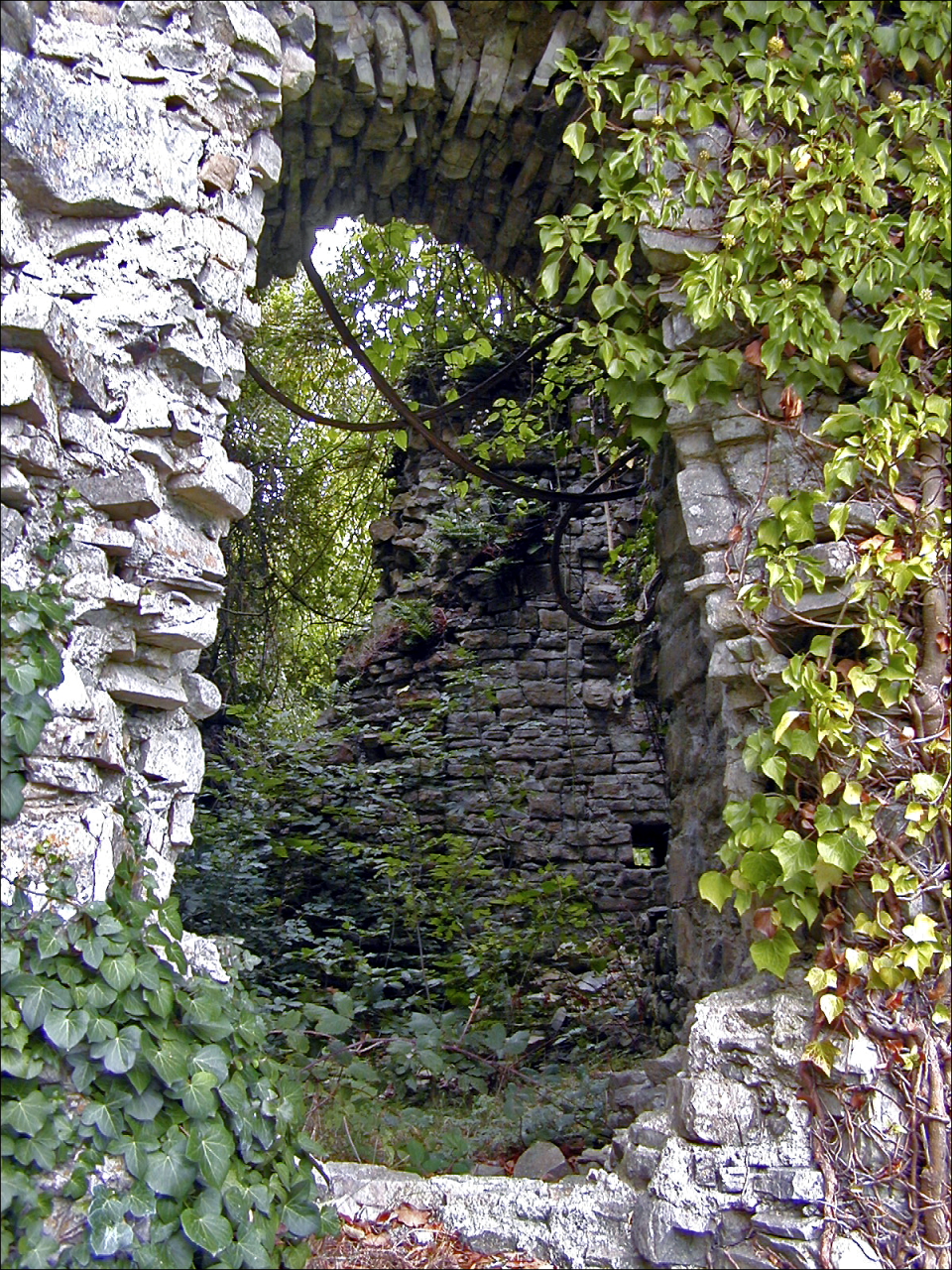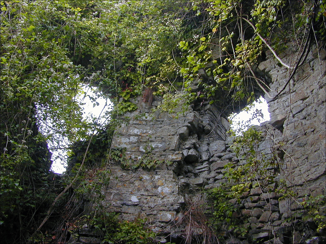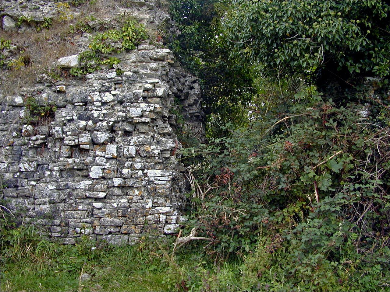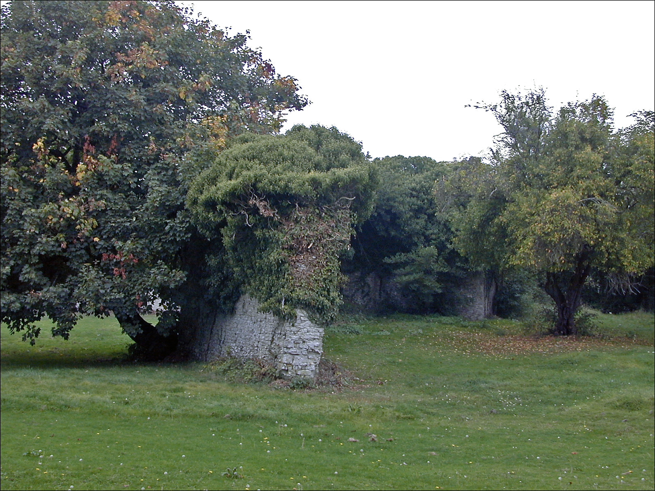 Overlooking the 30m deep ravine of the River Waycock north of the church are the remains of a 13th century wall 1m thick around a court 65m long by 47m wide with a more thinly walled 16th century outer court to the west. The moat has been filled in but there are extensive footings on the east side of the court and on the west side are overgrown ruins of a tower 7m in diameter with a rectangular latrine turret to the south and various other structures. Gilbert de Umfraville had a timber castle on this site in the 12th century. In the time of Edward II Oliver de St John obtained the castle when he married Elizabeth Umfraville, the young heiress. Mike Salter, The Castles of Gwent, Glamorgan & Gower, Folly Publications, 1991.