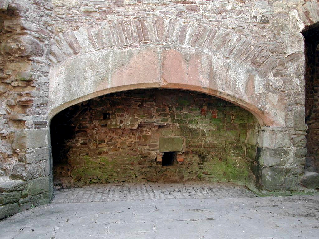 At the end of the Office Wing stands the impressive 15th-century hexagonal Kitchen Tower. Like the Closet Tower, the windows of the Kitchen Tower originally lay outside the line of the earlier curtain wall. Stairs from the Office Wing led to a mural passage into the first floor of the tower. The door below leads down to a flight of steps down into the basement of the tower. This was the Wet Larder named in a 17th-century document, and may have been used as a store for meat, cheeses and other dairy products. The stone-vaulted basement is a cold room even in the summer. It is lit by two windows and contains an impressive array of gunloops. The entrance to the kitchen itself is on the ground floor. Access is by way of a wide arch and a triangular vestibule, originally lit by two narrow windows. The kitchen is dominated by two large fireplaces, each with an oven. On the first floor above, the outer room has an ornate fireplace set between a pair of windows with seats in the embrasures, clearly a chamber for a person of consequence in the household.