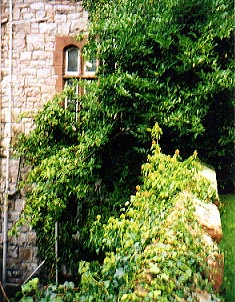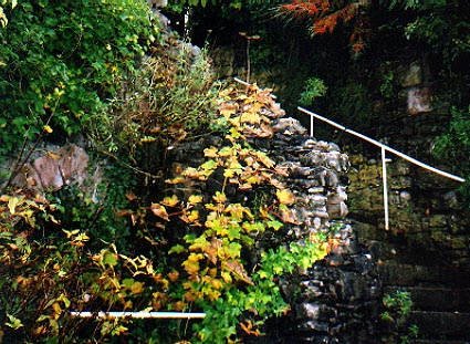 A closer look at the curving stairway into the upper bailey reveals a mysterious archway amongst the foliage. Was this another entrance to the upper bailey or an awkwardly placed latrine chute? The thickness of the upper bailey wall is evident behind the white handrail. | ![]() |