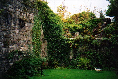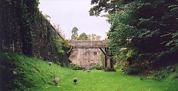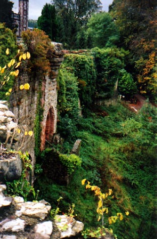 This is a view along the inner moat from beneath the stone bridge that now connects the two halves of the hotel either side of the moat. The curtain wall between the west gate and the upper bailey can be seen at the end of the moat. The wooden bridge between the baileys is not original. There is a stone-lined tunnel amongst the foliage to the right of the picture. | ![]() |