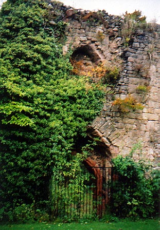 Looking at the inside of the west gate from within the inner moat, the remains of a chamber that once housed the portcullis machinery can be seen above the entrance passage. The stonework of this wall is not red sandstone as used for the earlier revetment walls and it probably represents the final stage of building under Reginald de Grey in 1295. However, the red sandstone moulding around the arch of the doorway provided continuity of style. | ![]() |