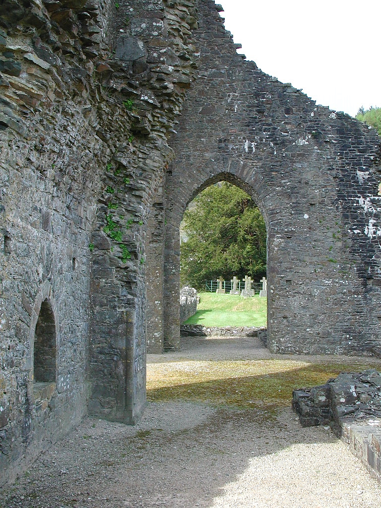 The remoteness, which contributed to the relative poverty of the community, now adds to the peace which surrounds the abbey at its site at the head of the two lakes from which the village takes its name. Much of the monastic building has fallen and now only the abbey church, dedicated to the Blessed Virgin Mary and St John the Baptist, and part of the cloister remain. The modern entrance leads into the church from the west, but immediately below the entrance gate, the stone footings of walls on the right, and of three pairs of columns ahead belong to the church that was begun but never completed. In the event, only the eastern four bays of the nave and south aisle were actually built higher than foundation level, and of the planned north aisle, only the easternmost bay was built as a small room accessible from the north transept.