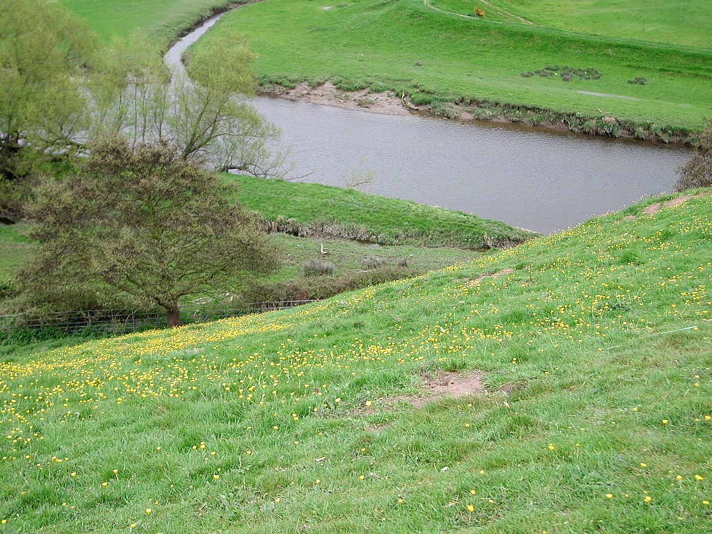 View down the steep sided motte to the River Clwyd below.