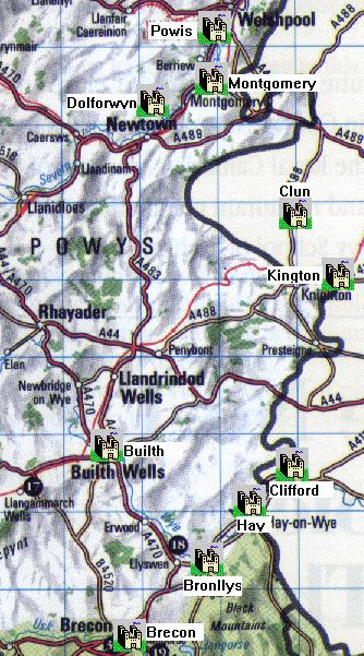 This partial map of Wales shows the locations of what many consider to be the important or major castles for this section of the Welsh Marches. A castle icon has been placed at the approximate locations. Select castles by either clicking directly on the map, or from the list of castles next to the map.