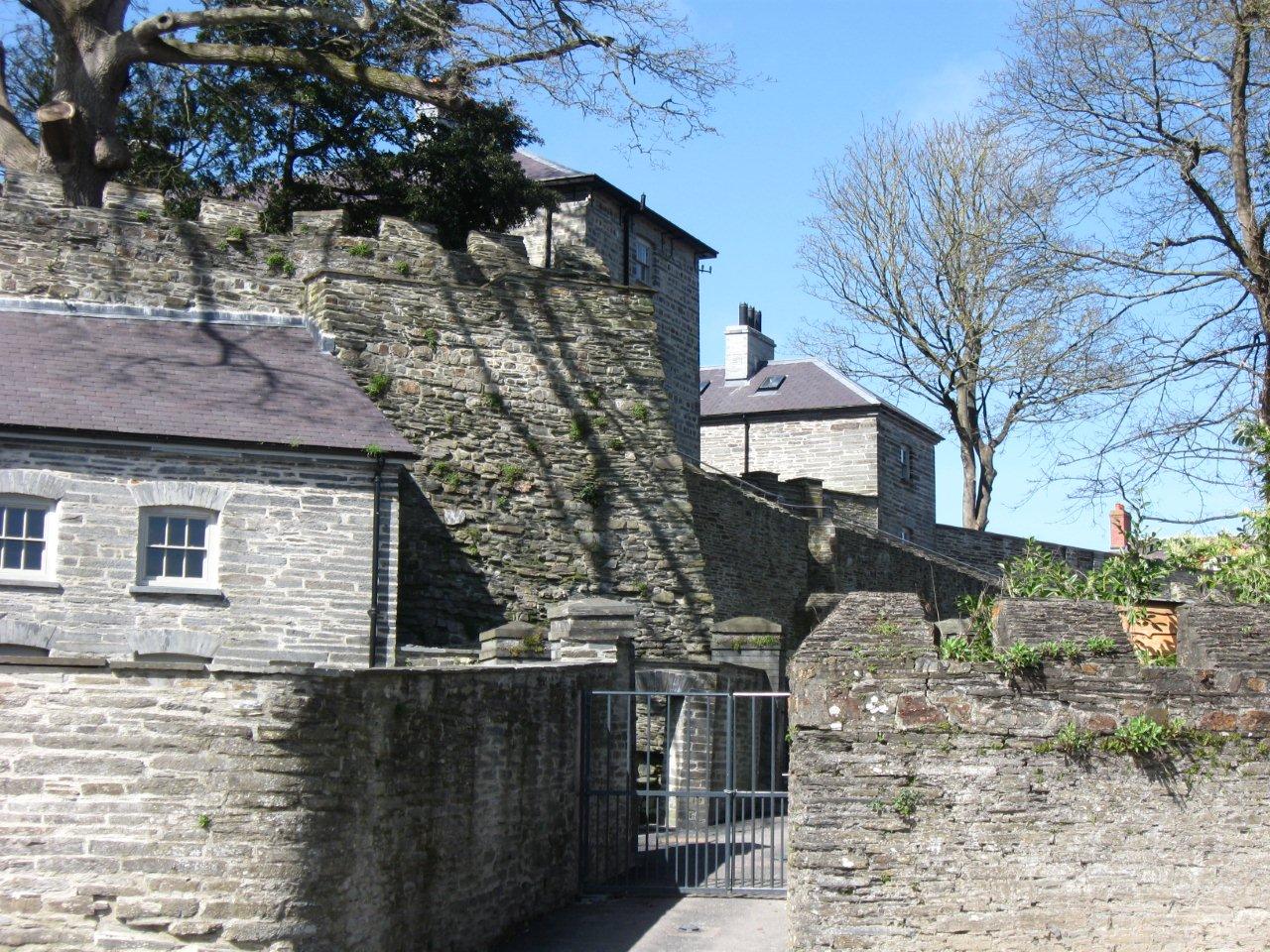 A further two towers exist on the eastern side of the castle but the wall between them was removed during landscaping to improve the view from the mansion. A slope overlooking the river was made between the towers to create a hanging garden. The eastern tower is unusual in having a flattened face on an otherwise rounded exterior and it would have provided good internal accommodation without the weakness of square corners, which tend to collapse when undermined.