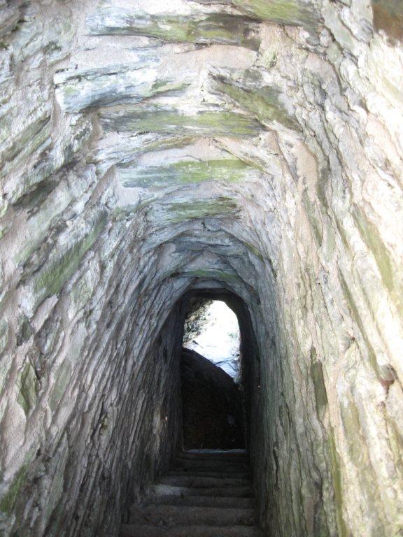 At the inner face of the east tower, two flights of stairs descend from courtyard level past side-facing arrow loops to guardrobe chambers at the front of the tower.