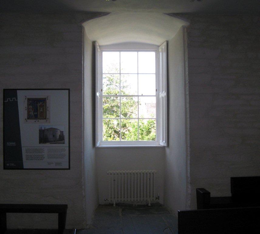 The buttresses at each side of the great tower provided additional strength where it projected into the dry moat. The rectangular windows of the later mansion occupy the positions of the original embrasures.
