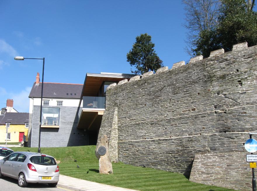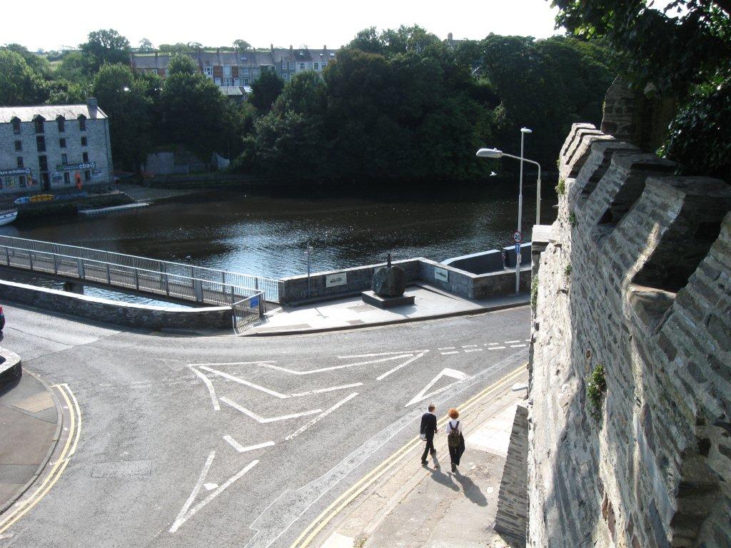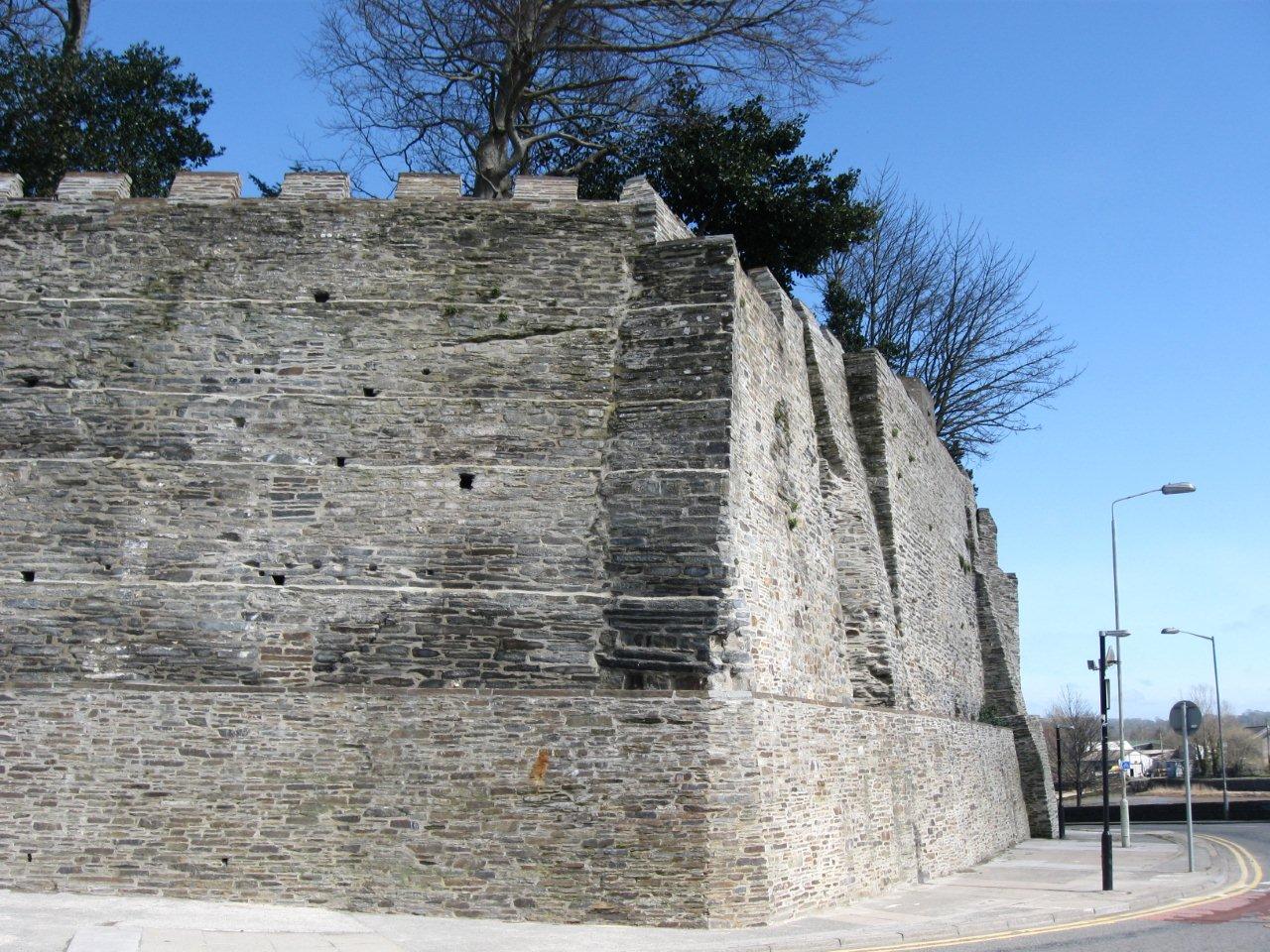 The view along the outside of the southern revetment wall from the south east tower. The road and bridge did not exist in medieval times so the castle was on the riverbank.