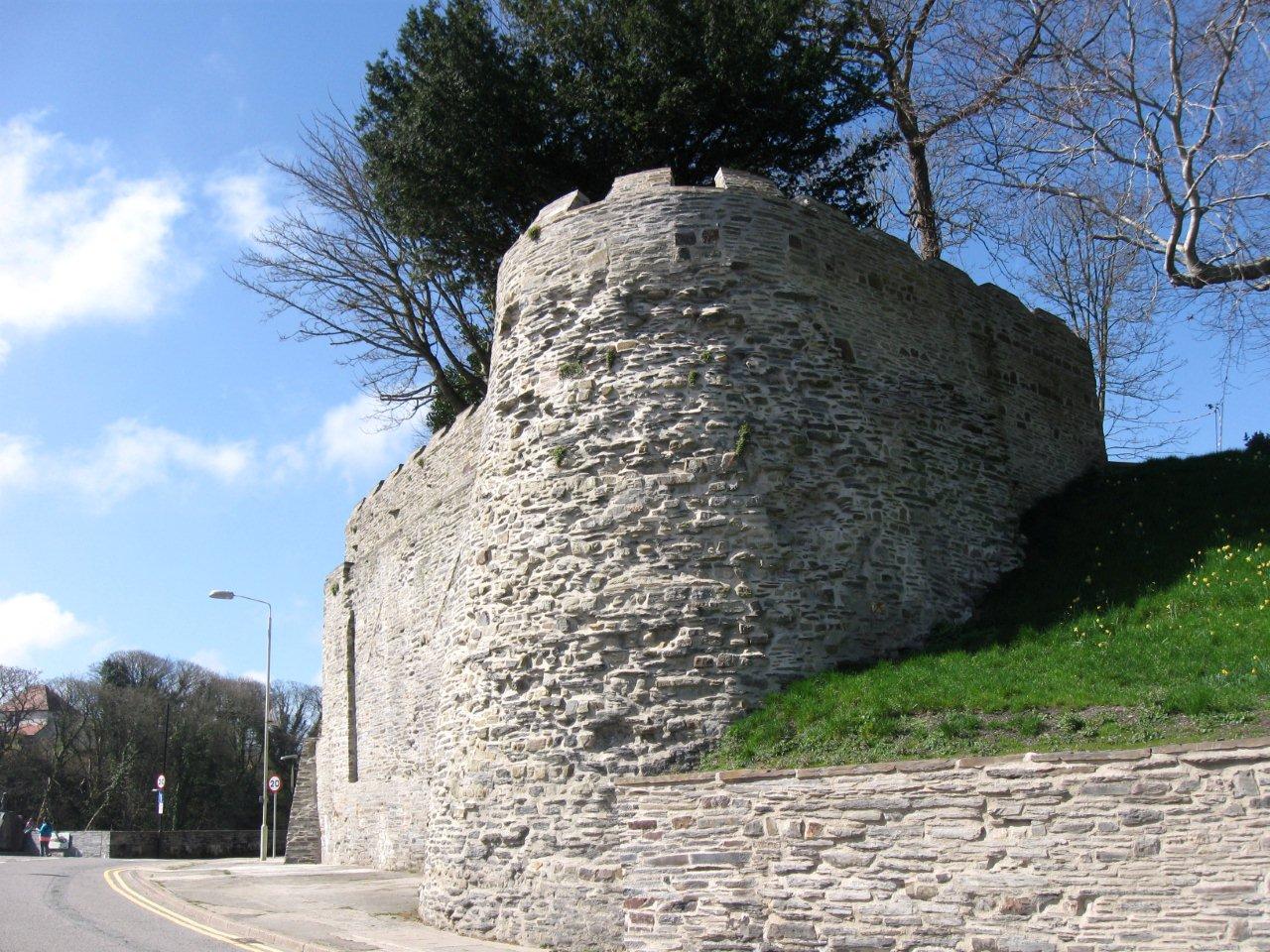 The south east tower and southern revetment wall. The tower has been altered and is lower than it would have been.