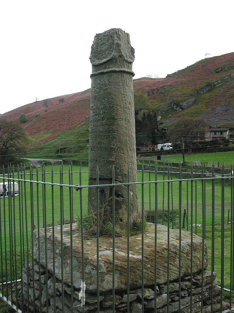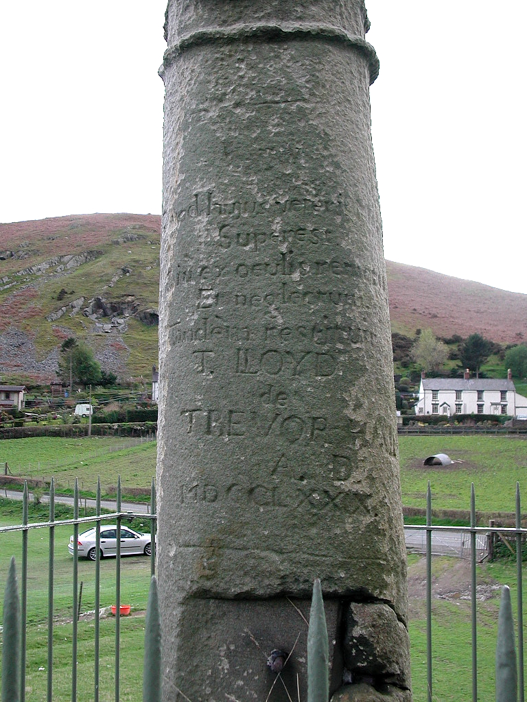 The cross was pulled down in the 17th century during the Civil War, and the rest had been removed before this column was re-erected by T. Lloyd of Trevor Hall, and event commemorated in the late inscription on the rear. The mound was excavated at this time, and a skeleton found in a long cist, but it is not clear from the description whether this burial was prehistoric or early medieval.
