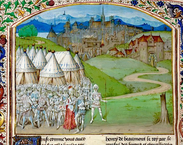 Above: 15th-century manuscript illustration depicting Roger Mortimer and Queen Isabella in the foreground.