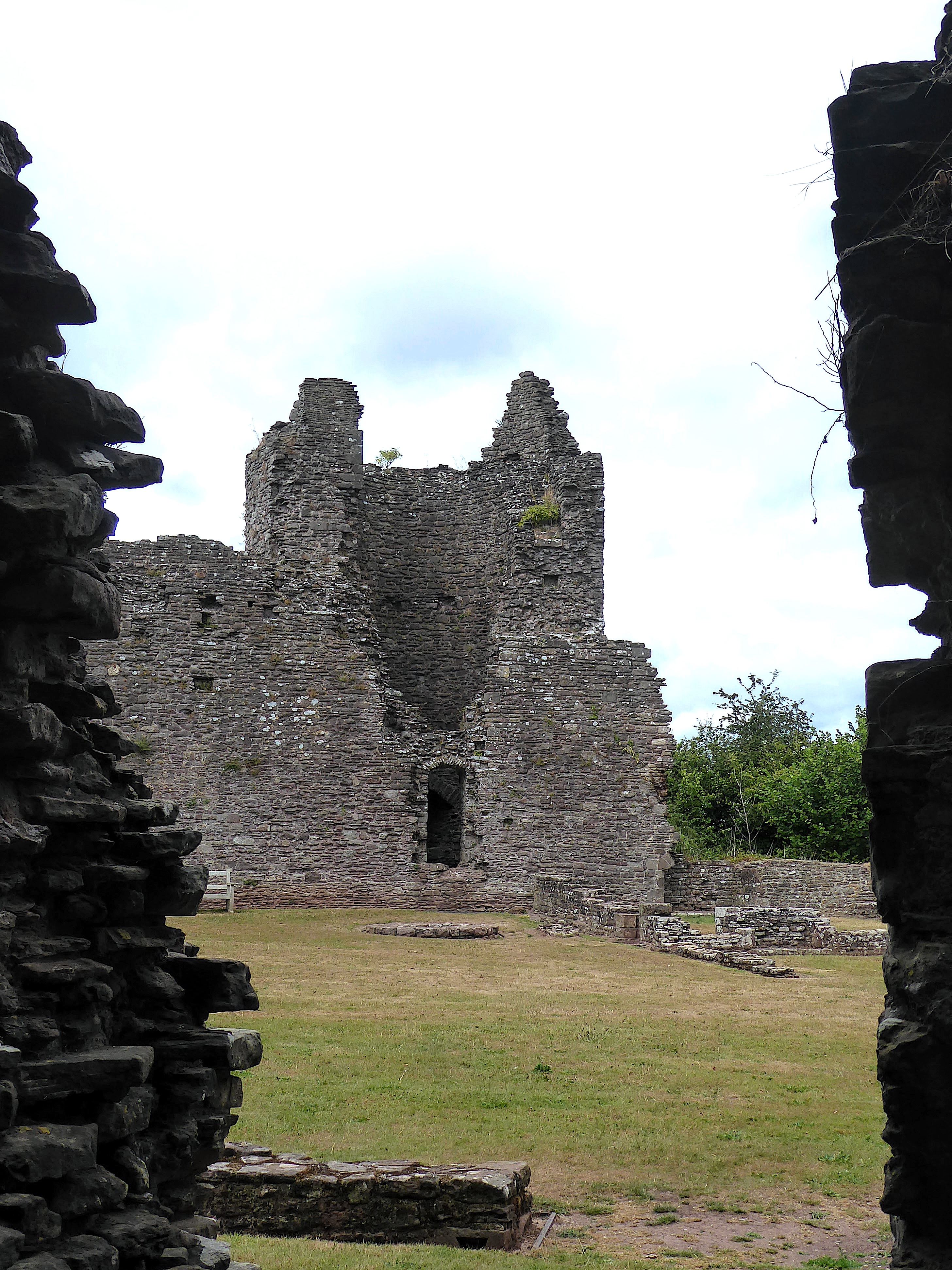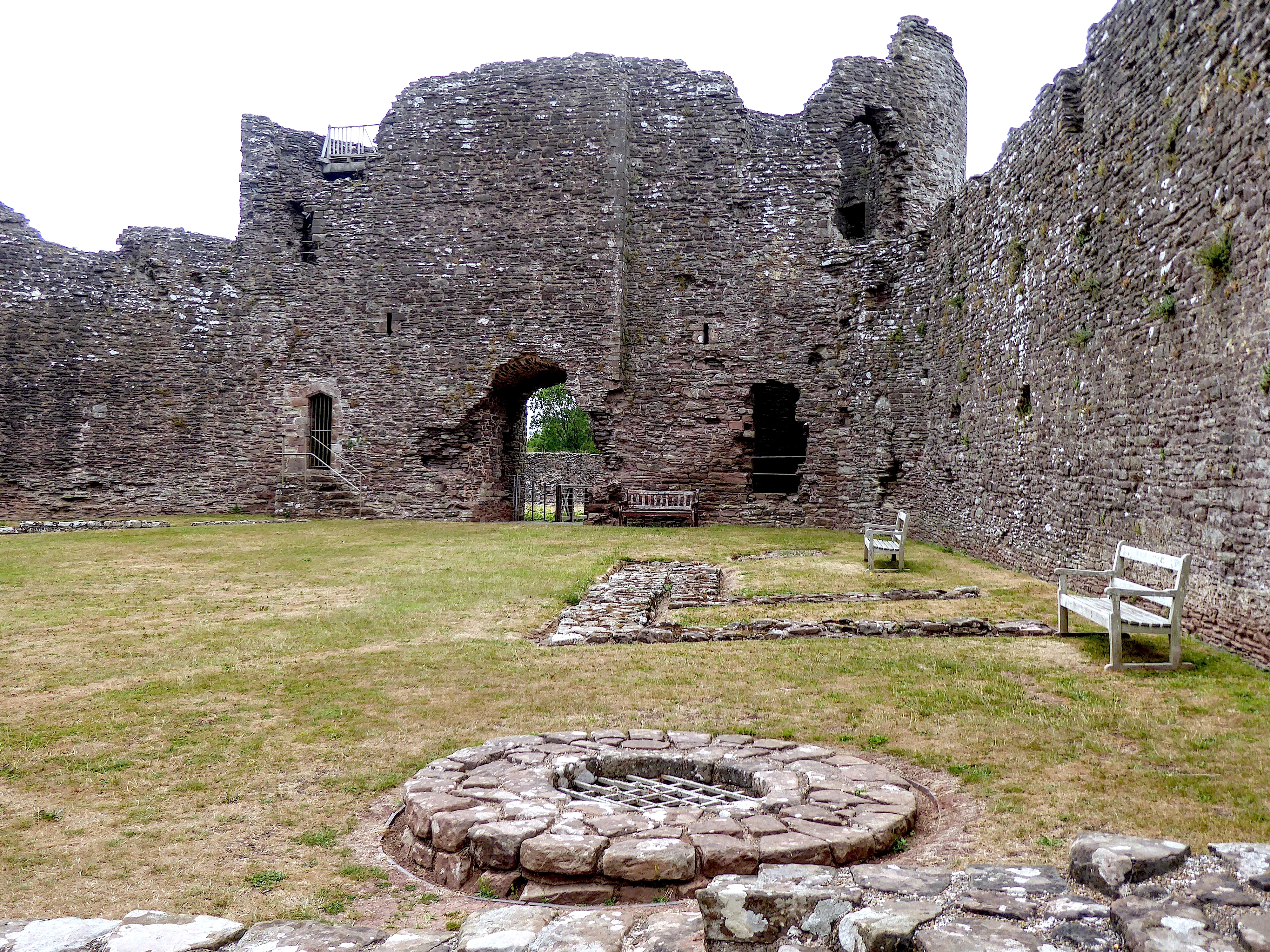 A view from the low remains of an internal building towards the inner gatehouse. The castle's well is in the foreground.