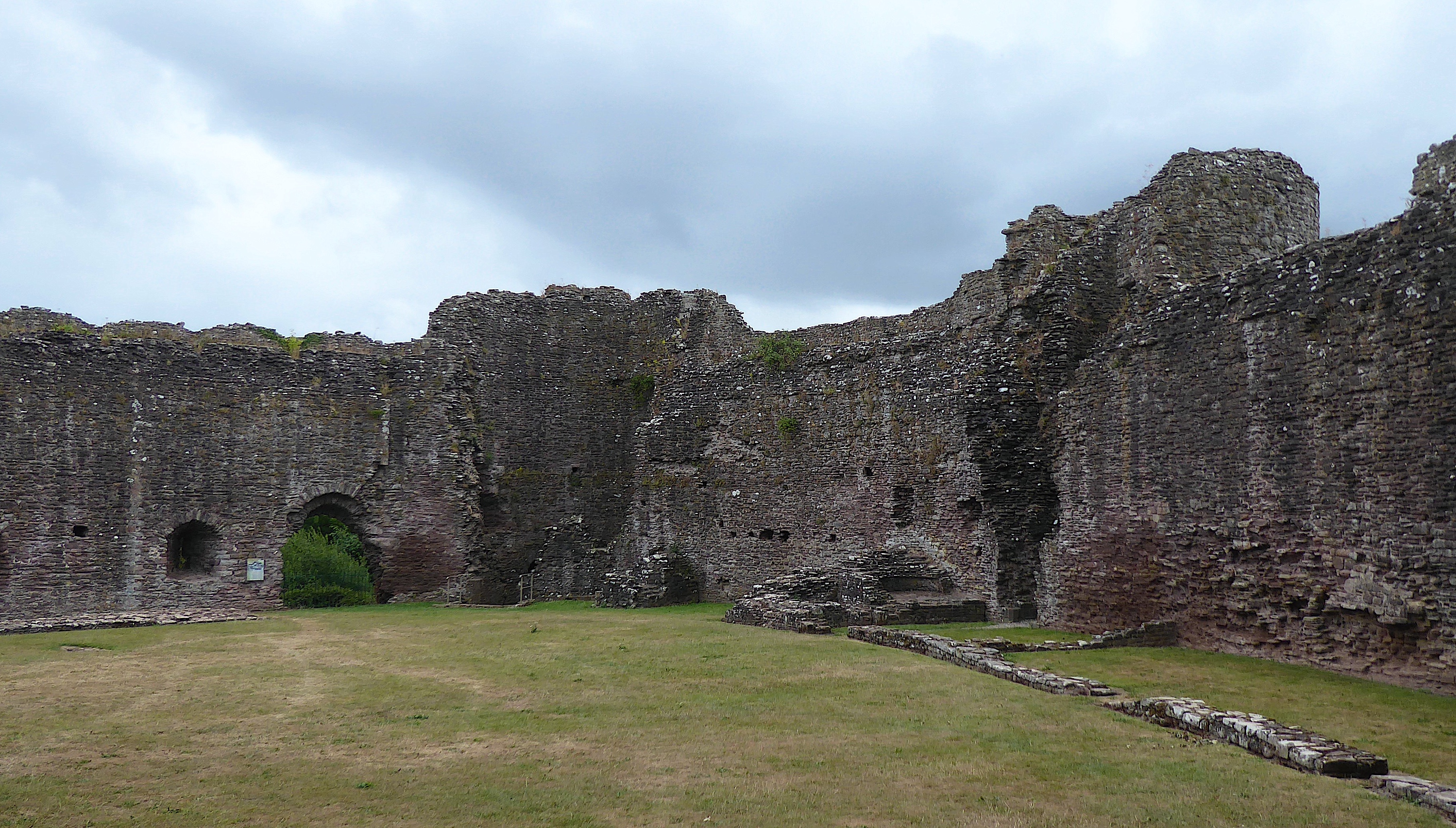 Below: Looking across the inner bailey at the east and south walls. The old southern gateway is between the south-east tower and demolished square keep.